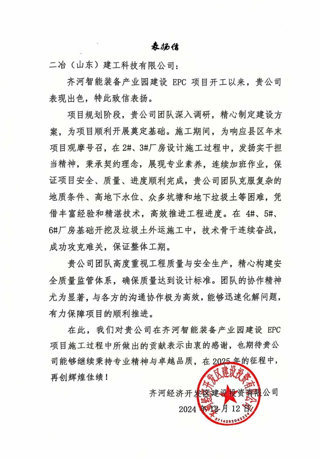 齊河縣經(jīng)濟(jì)開(kāi)發(fā)區(qū)建設(shè)投資有限公司的來(lái)信,對(duì)二冶(山東)建工科技有限公司在項(xiàng)目施工過(guò)程中的杰出貢獻(xiàn)表達(dá)了由衷的感激之情,并期望其在 2025 年繼續(xù)堅(jiān)守專業(yè)精神,保持卓越品質(zhì),再鑄輝煌佳績(jī)。