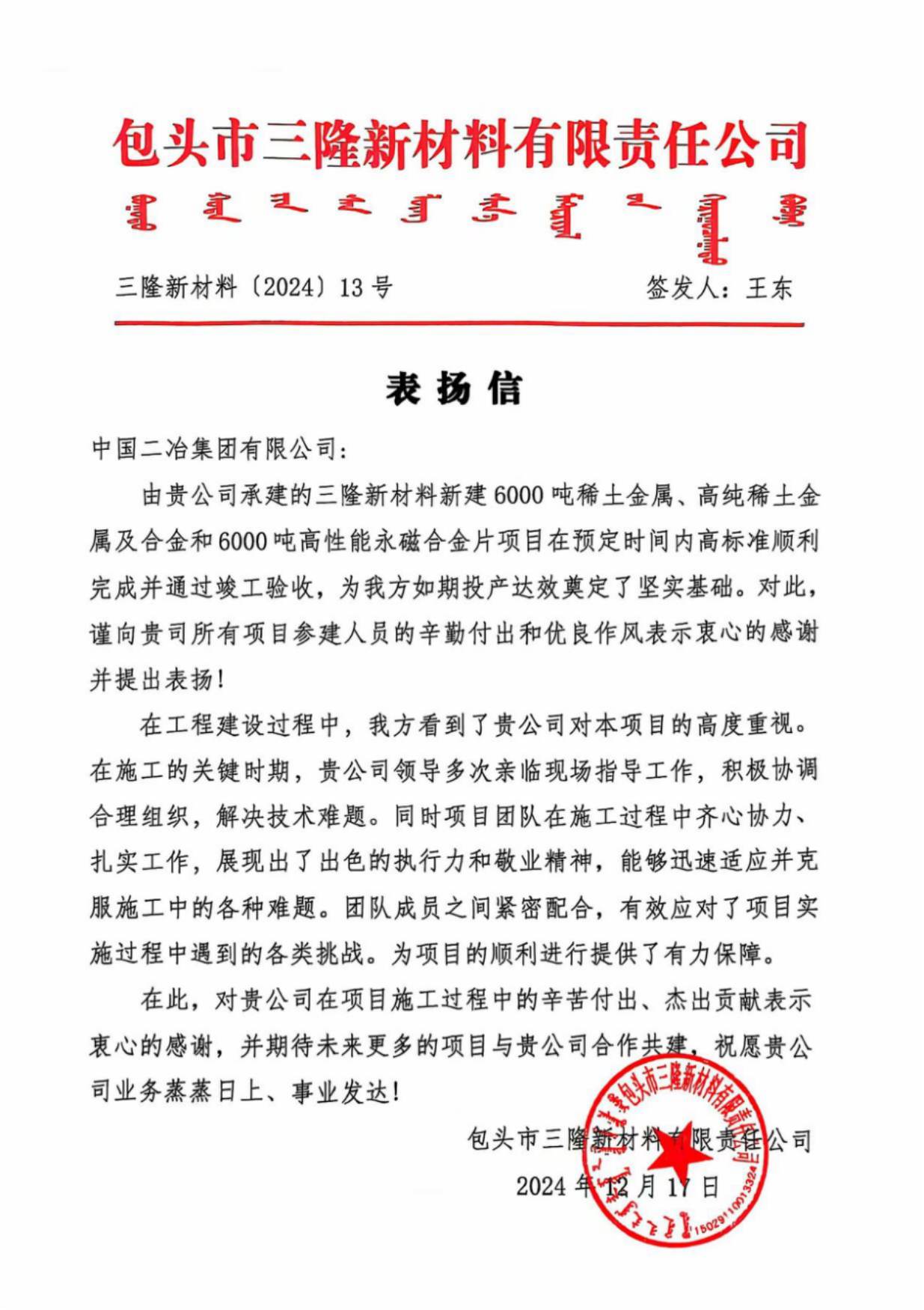 12月25日,中國二冶接連收到包頭金穗實(shí)業(yè)有限責(zé)任公司、包頭市三隆新材料有限責(zé)任公司兩封表揚(yáng)信,對中儲糧項(xiàng)目、三隆項(xiàng)目管理團(tuán)隊(duì)高質(zhì)量完成既定目標(biāo)工期的杰出表現(xiàn)提出表揚(yáng)。