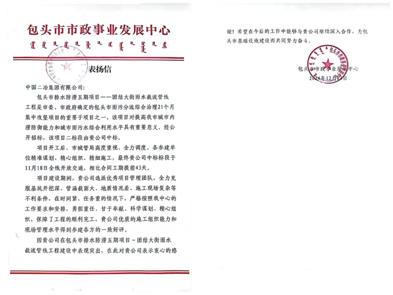 近日,中國二冶收到包頭市市政事業(yè)發(fā)展中心表揚信。高度贊揚項目管理團隊提前43天實現(xiàn)團結(jié)大街雨水截流管線工程施工二標段全線開放交通,順利通車的目標。