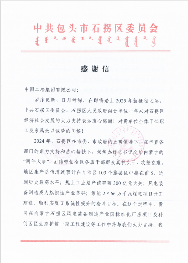 信中指出,2024年,石拐區(qū)在市委、市政府的正確領(lǐng)導下,在市直各部門的鼎力支持和悉心幫扶下,聚焦辦好習近平總書記交給內(nèi)蒙古的“兩件大事”,團結(jié)帶領(lǐng)全區(qū)各族干部群眾真抓實干、攻堅克難,地區(qū)生產(chǎn)總值增速預計在自治區(qū)103個旗縣區(qū)中排在前5,達到歷史最高水平;規(guī)上工業(yè)總產(chǎn)值突破300億元大關(guān);風電裝備制造成為旗幟性產(chǎn)業(yè)集群;蒙能2×66萬千瓦煤電項目開工建設(shè)。順利實現(xiàn)了系統(tǒng)性提升的奮斗目標。在這個過程中,中國二冶在內(nèi)蒙古石拐區(qū)風電裝備制造產(chǎn)業(yè)園標準化廠房項目及科創(chuàng)園區(qū)生態(tài)護坡一期項目等工程建設(shè)中給予大力支持,我們銘記在心、深懷感激。明年是“十四五”規(guī)劃的收官之年,也是石拐區(qū)爬坡過坎、站上新的歷史臺階的關(guān)鍵一年。我們將繼續(xù)堅持以習近平新時代中國特色社會主義思想為指導,認真貫徹落實上級各項部署要求,以永不懈怠的精神狀態(tài)和一往無前的奮斗姿態(tài),凝心聚力、團結(jié)拼搏,奮力實現(xiàn)歷史性跨越的奮斗目標。