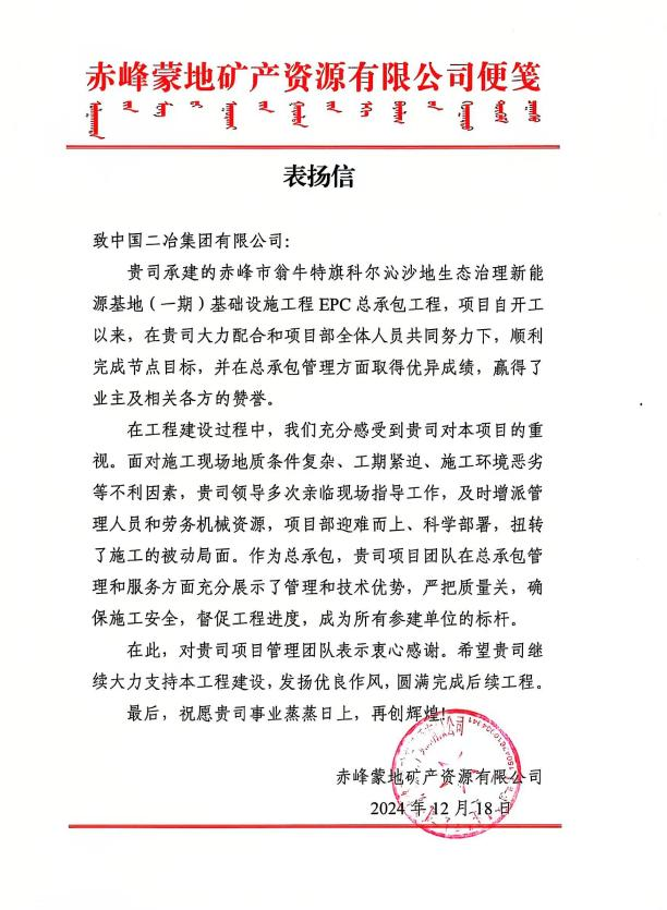 赤峰蒙地礦產(chǎn)資源有限公司在信中表示,赤峰翁牛特科爾沁沙地治理項(xiàng)目自開工建設(shè)以來,面對諸多不利因素,項(xiàng)目建設(shè)團(tuán)隊(duì)主動作為,精心策劃、合理安排,在施工管理過程中對施工質(zhì)量嚴(yán)格把關(guān),最終安全優(yōu)質(zhì)完成項(xiàng)目節(jié)點(diǎn)目標(biāo),樹立了央企典范。