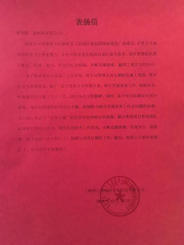 土默特右旗創(chuàng)科農(nóng)業(yè)科技有限公司在信中表示,土右旗食品園區(qū)標(biāo)準(zhǔn)化廠房項(xiàng)目團(tuán)隊(duì)面對各種挑戰(zhàn)和復(fù)雜情況,始終能夠從全局出發(fā),冷靜應(yīng)對、及時調(diào)整,穩(wěn)步推進(jìn)施工進(jìn)度,高效開展工程建設(shè)任務(wù),順利完成節(jié)點(diǎn)目標(biāo),以實(shí)際行動彰顯了專業(yè)能力和責(zé)任擔(dān)當(dāng)。