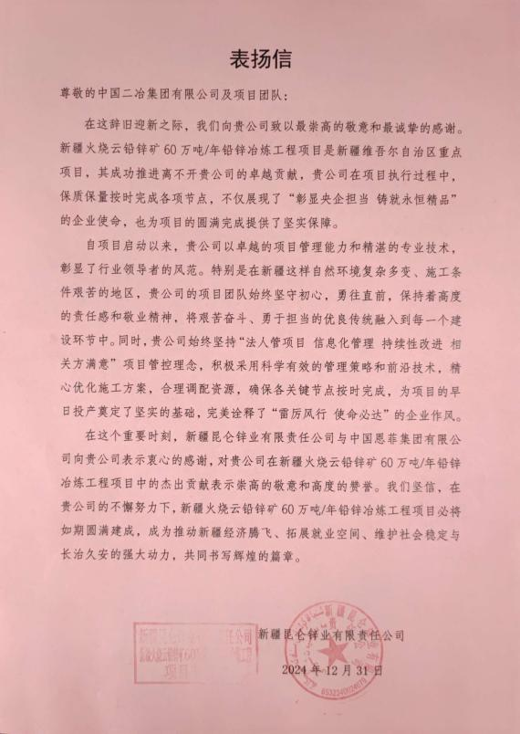 新疆昆侖鋅業(yè)有限責(zé)任公司在信中表示,自項(xiàng)目啟動以來,新疆火燒云鉛鋅礦60萬噸/年鉛鋅冶煉工程項(xiàng)目以卓越的項(xiàng)目管理能力和精湛的專業(yè)技術(shù),彰顯了行業(yè)領(lǐng)導(dǎo)者的風(fēng)范。特別是在面對自然環(huán)境復(fù)雜多變、施工條件艱苦的挑戰(zhàn),項(xiàng)目團(tuán)隊(duì)始終堅(jiān)守初心,勇往直前,保持高度的責(zé)任感和敬業(yè)精神,為項(xiàng)目的早日投產(chǎn)奠定堅(jiān)實(shí)的基礎(chǔ)。