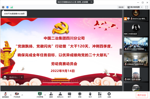 9月14日,四川分公司召開“黨旗飄揚(yáng)、黨徽閃光”行動暨“大干 120 天、沖刺四季度,確保完成全年任務(wù)目標(biāo),以優(yōu)異成績向黨的二十大獻(xiàn)禮”勞動競賽動員會,分公司黨委書記劉喆作動員講話并主持會議,公司副總經(jīng)濟(jì)師、四川分公司總經(jīng)理鮑文明宣布勞動競賽啟動。