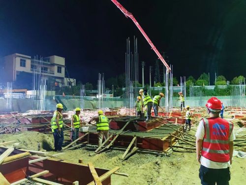 在4#廠房混凝土澆筑期間,夜已很深,陰雨連綿,但是施工現(xiàn)場依舊燈火通明,管理人員施工口令陣陣,運輸車輛源源不斷,各種機械聲不絕于耳,構(gòu)成了一幅壯觀的“挑燈夜戰(zhàn)圖”……面對緊張的節(jié)點工期、繁重的任務(wù)目標,在這沒有硝煙的戰(zhàn)場上,項目上下正進行著一場場與時間賽跑的攻堅戰(zhàn),各施工作業(yè)班組人員采取“緊密配合,見縫插針,立體交叉”的勞動形式,快馬加鞭,攻堅克難,全力推進項目建設(shè),有效地保障了工程進度。