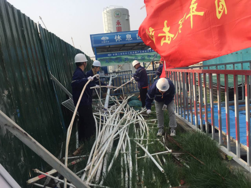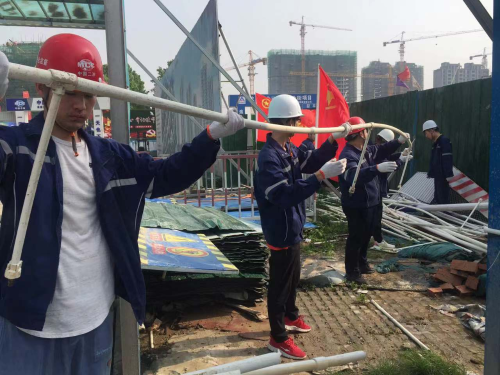 在義務(wù)勞動活動中,團(tuán)旗和青年突擊隊(duì)旗在工地迎風(fēng)飄揚(yáng),項(xiàng)目部團(tuán)員青年們利用手推車、三輪車對施工現(xiàn)場的廢棄鋼筋、土方布、鋼管,pvc水管等施工材料進(jìn)行了統(tǒng)一清理和歸類堆放,在搬運(yùn)施工材料的過程中,大家采取接力的形式將一車車施工材料堆放整齊,將廢棄物清理干凈,雖然大家干的汗流浹背,但始終歡聲笑語、干勁十足,沒有絲毫的停歇。