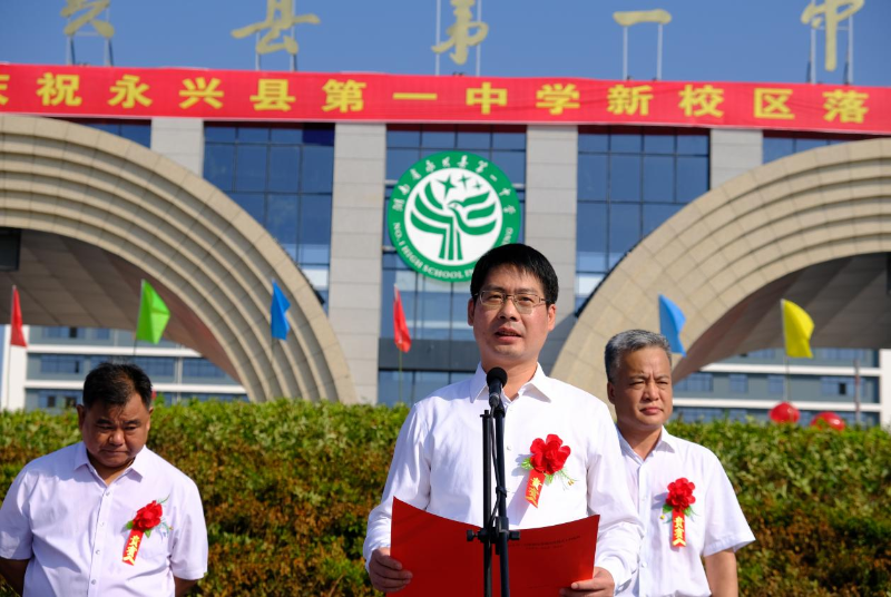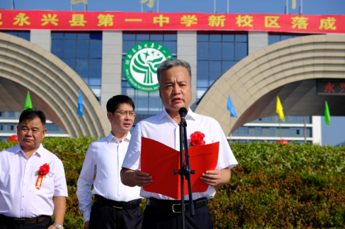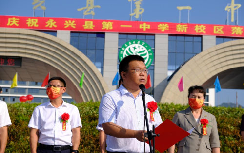 揭牌儀式首先由永興一中校長(zhǎng)胡兆文致辭。他指出,永興一中項(xiàng)目建設(shè)是造福當(dāng)?shù)匕傩盏囊豁?xiàng)重大民生工程,是功在當(dāng)代,利在千秋的一件大事。他希望學(xué)生們心懷天下做有家國(guó)情懷的人,意志堅(jiān)韌做積極進(jìn)取的人,心胸開(kāi)闊做陽(yáng)光大度的人,心存善意做助人為樂(lè)的人。最后,他祝學(xué)生們?cè)谛碌膶W(xué)??鞓?lè)成長(zhǎng)。